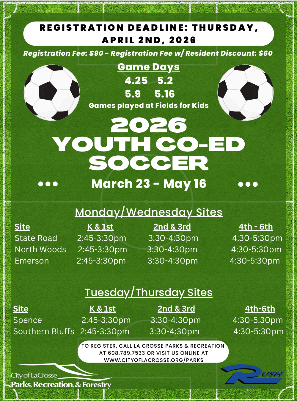 The La Crosse Parks, Recreation & Forestry Department is partnering with RUSH Wisconsin West Soccer Club to offer Youth Co-Ed Soccer in the spring for kids in grades K- 6. Practices will be held at local schools with games at Field for Kids on Saturdays.